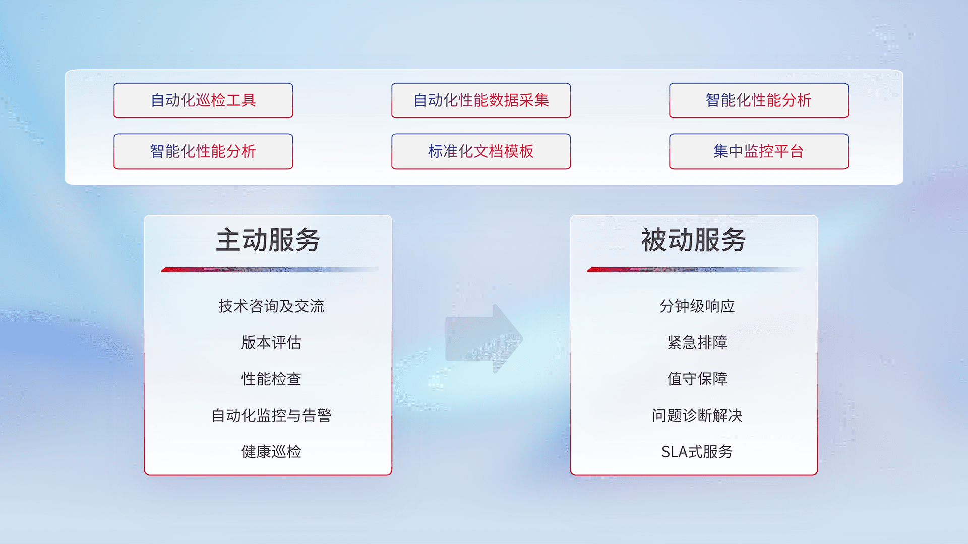 智能化工具和标准化文档,,,保障服务质量,,,,提供主动服务(包含技术咨询、、、、版本评估、、、性能检查、、、自动化监控与告警、、、健康巡检)和被动服务包含(分钟级响应、、、、紧急排障、、值守保障、、、问题诊断解决、、、SLA服务)。。